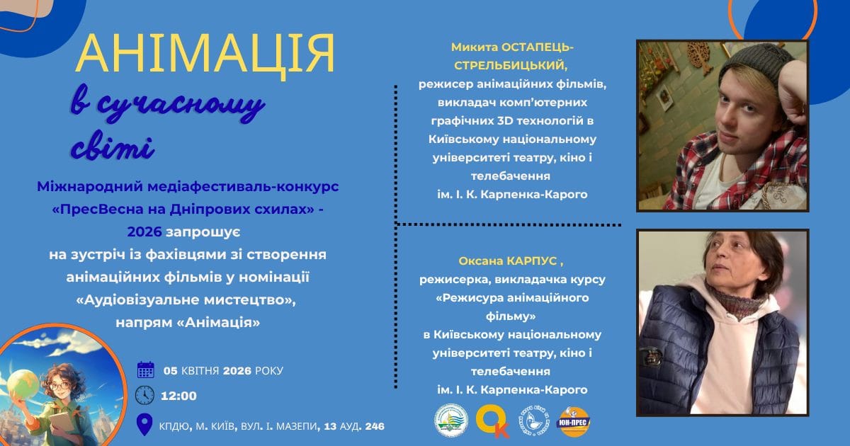 Міжнародний медіафестиваль-конкурс "ПресВесна на Дніпрових схилах" -2026 Інформаційно-творче агентство "ЮН-ПРЕС" Київського Палацу дітей та юнацтва запрошує на зустріч із фахівцями зі створення анімаційних фільмів у номінації «Аудіовізуальне мистецтво», напрям «Анімація».